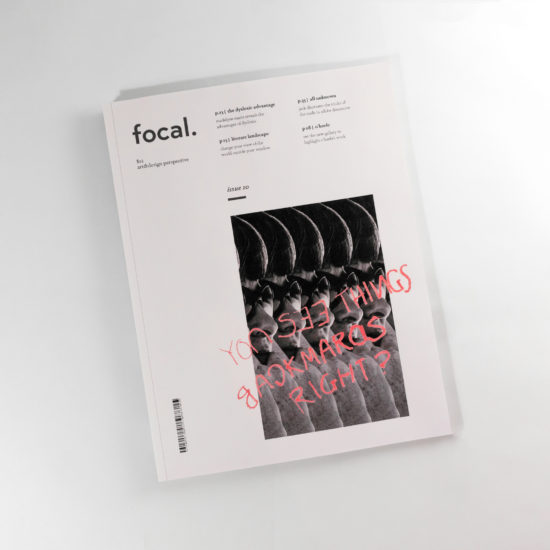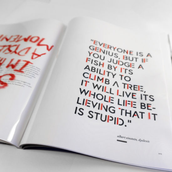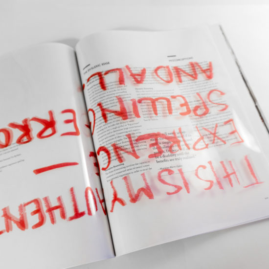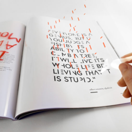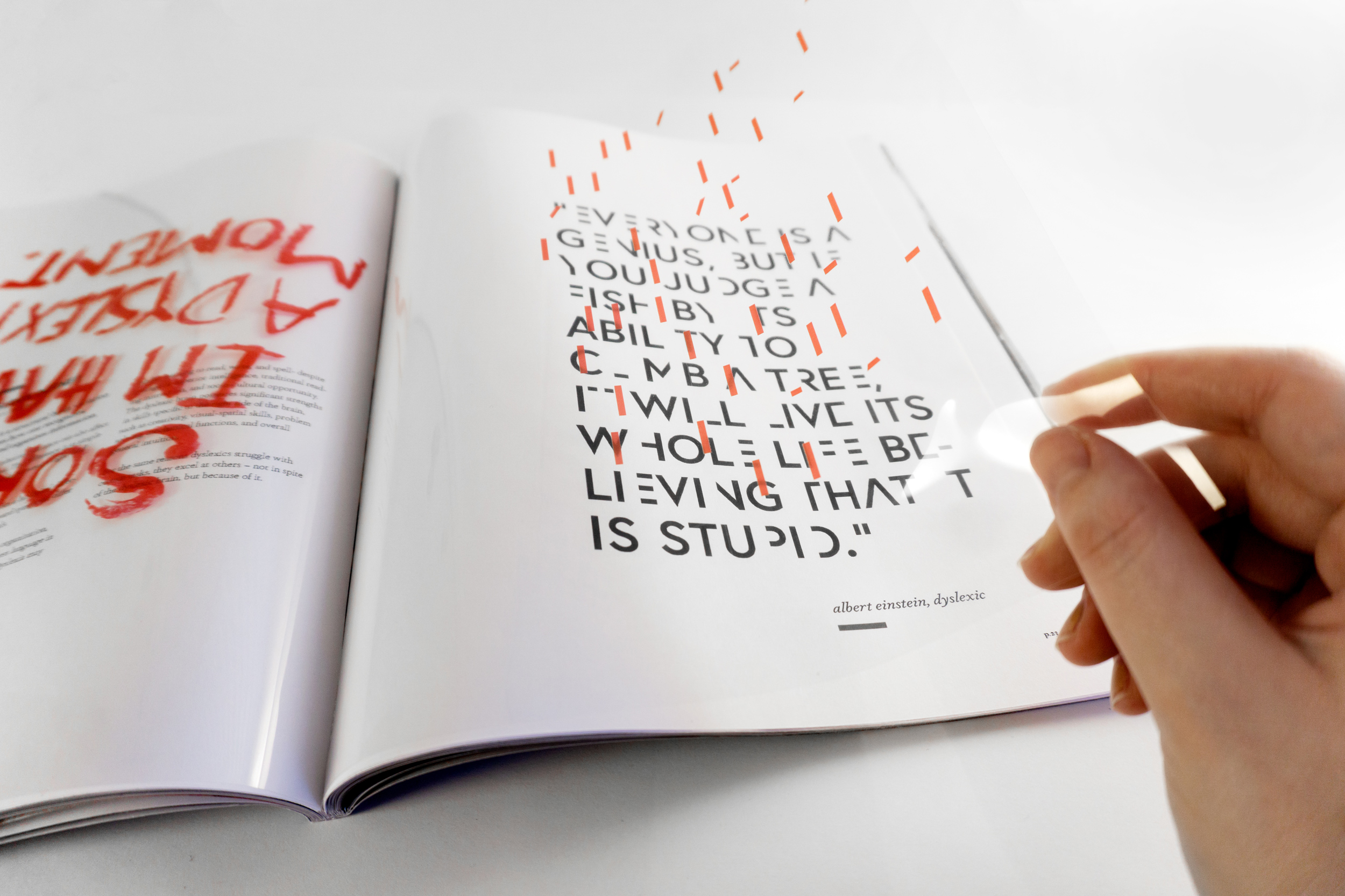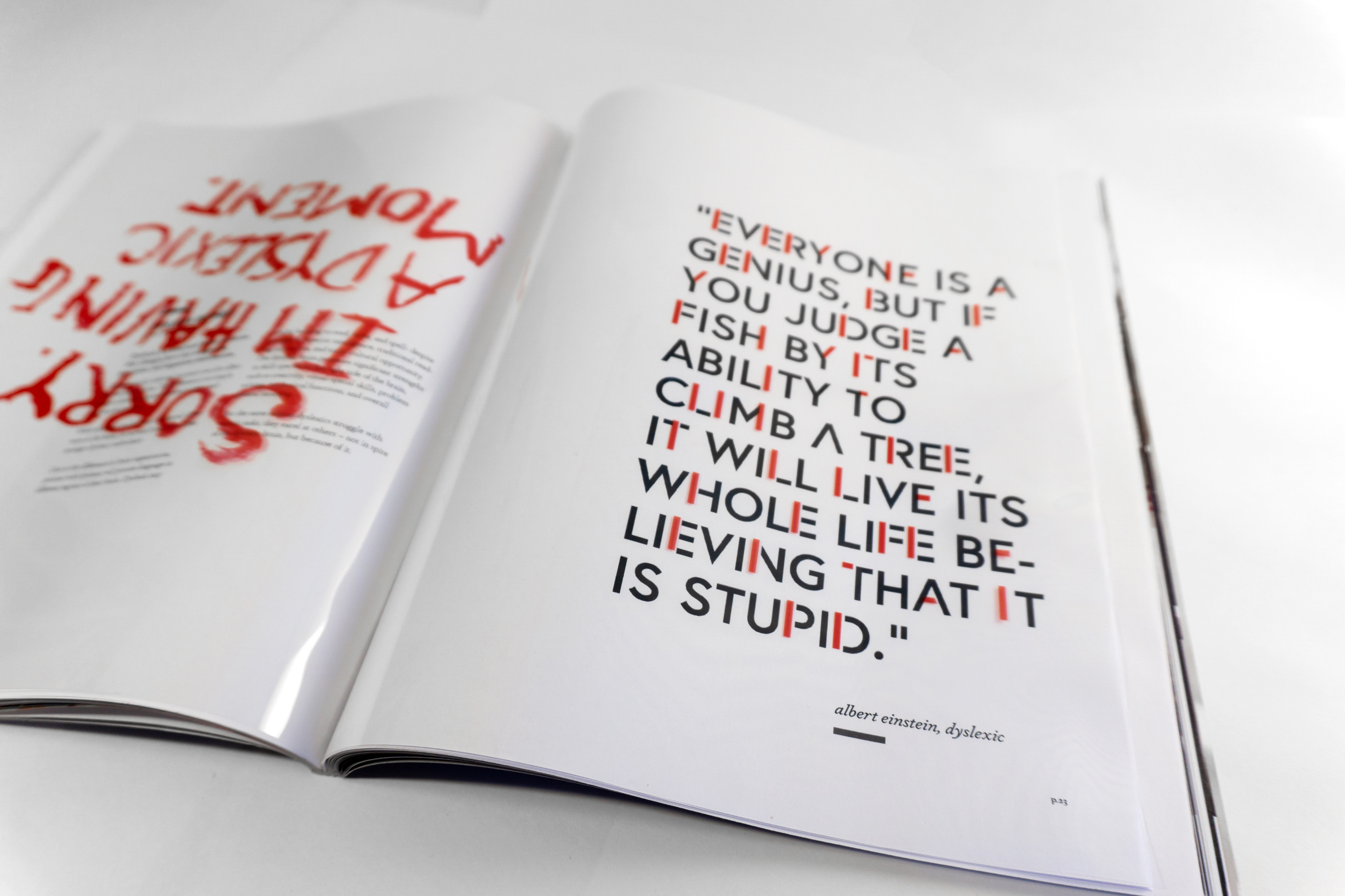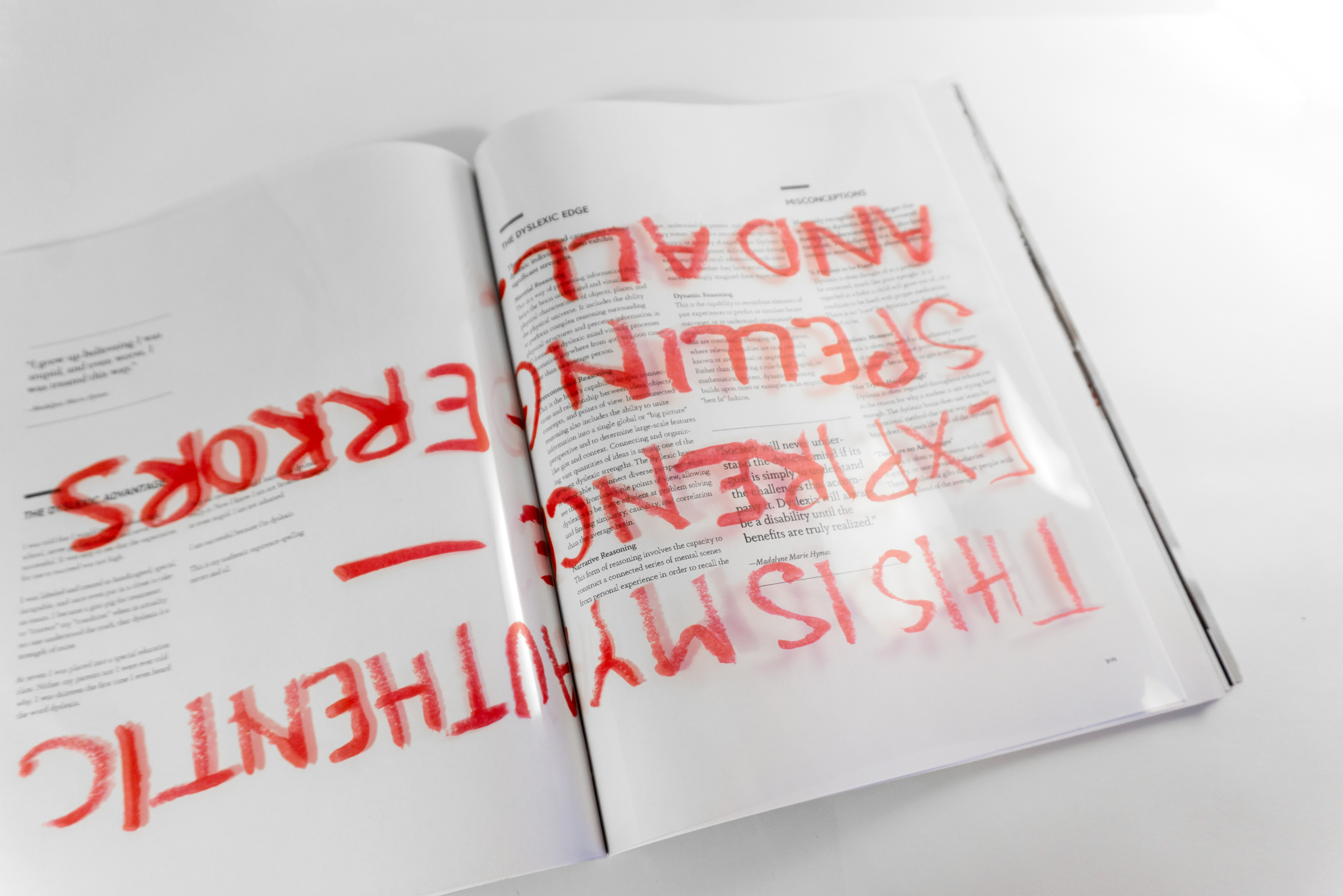 For this issue, the imagery, type and image alterations, and nameplate are original pieces. The feature spread highlights an article focusing on the experience of dyslexics. As such, the magazine used melted crayon to write the feelings of dyslexics in RED or to replace parts of the black type, printed on a transparency film, and overlaid on the spreads. The spreads are also “upside down” while reading through the magazine, making the user interact more with the magazine to read and have a hint at the challenges that may arise for a person with dyslexia. All text alterations provide a varying effect similar to how the type may be altered when viewed with a dyslexic eye.