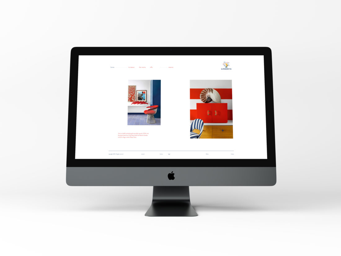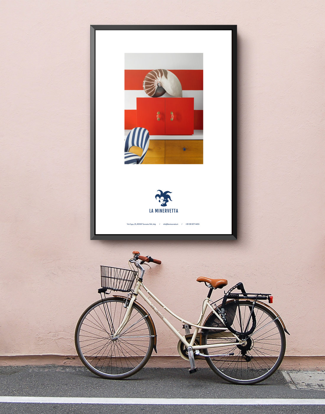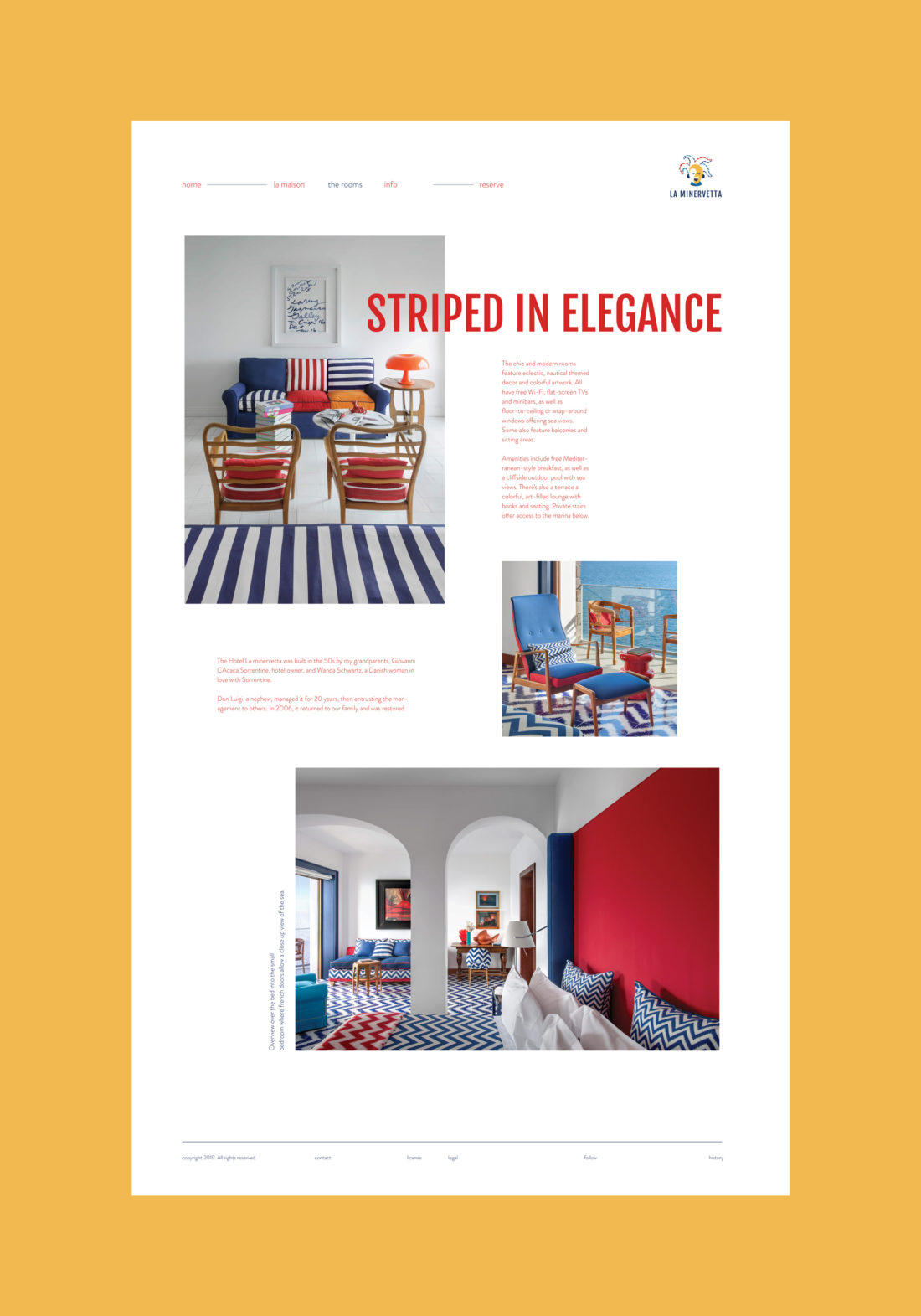 La Minervetta is a hotel located in Sorrento, Italy. It is set on the cliffside overlooking the Mediterranean Sea, allowing all rooms to have a view of the Marina Grande. The pictorial mark reflects the history of mask use in Italy, as well as the cultural face masks that are used for decoration throughout the hotel. The 1950’s boutique hotel executes a bold color palette, which is consistent in the branding.